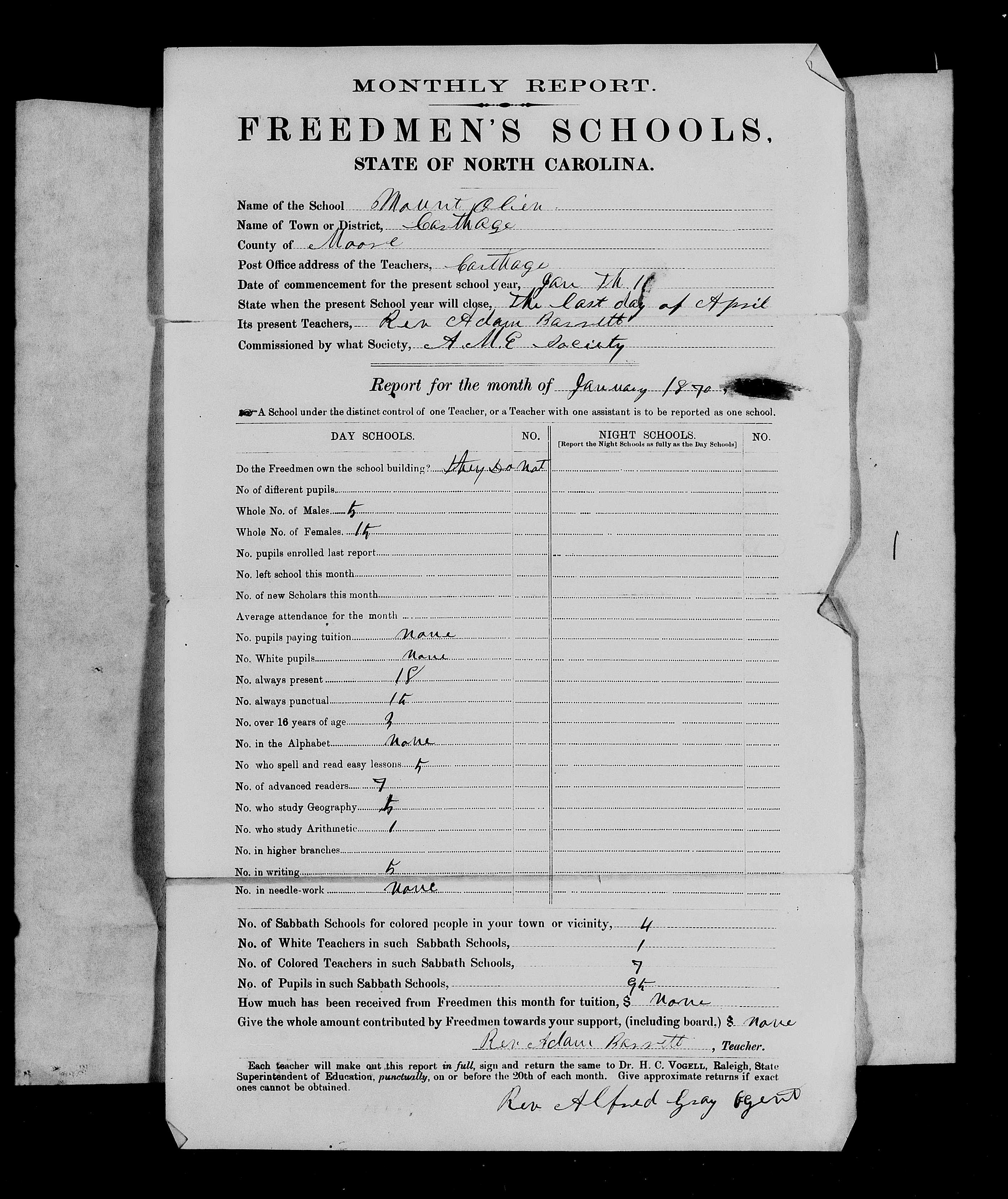 By January 1870, just five years after the end of the Civil War, Barrett appears in the Monthly Report of Freedmen’s Schools, State of North Carolina as Rev. Adam Barrett, listed as the teacher of Mt. Olive School in Carthage, Moore County. The school was commissioned by the African Methodist Episcopal Society. The use of the title Reverend at this early date reflects that Barrett was already serving in ministry while also teaching, embodying the close relationship between education and the church during Reconstruction. Teaching in a Freedmen’s School was more than instruction; it was an act of resistance against the illiteracy imposed by slavery and a declaration of hope for future generations.[Freedmen’s School report]